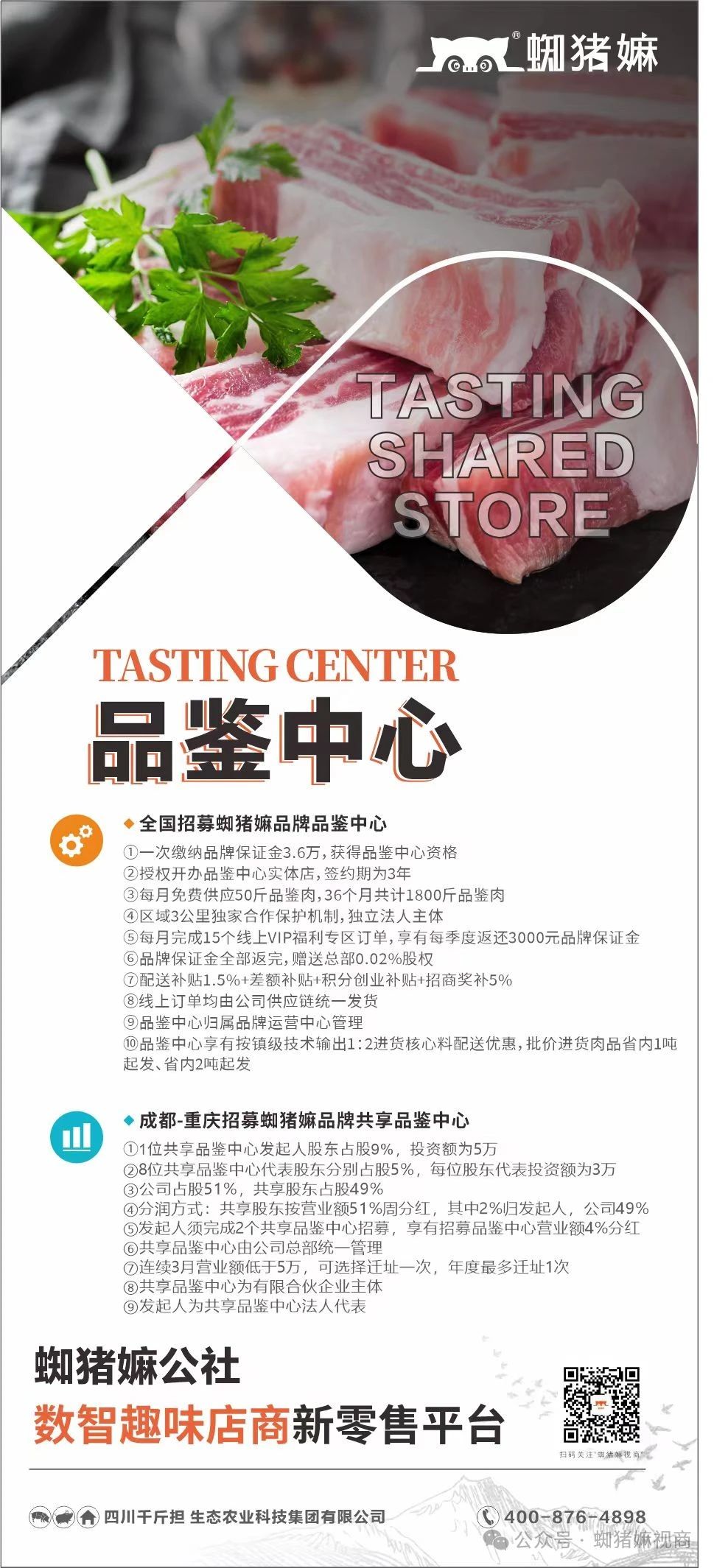1、全国品鉴中心:全国招募蜘猪嫲品鉴中心,一次缴纳品牌保证金3.6万,获品鉴中心资格,授权开办品鉴中心实体店,签约期3年,公司每月免费供应50斤品鉴肉。